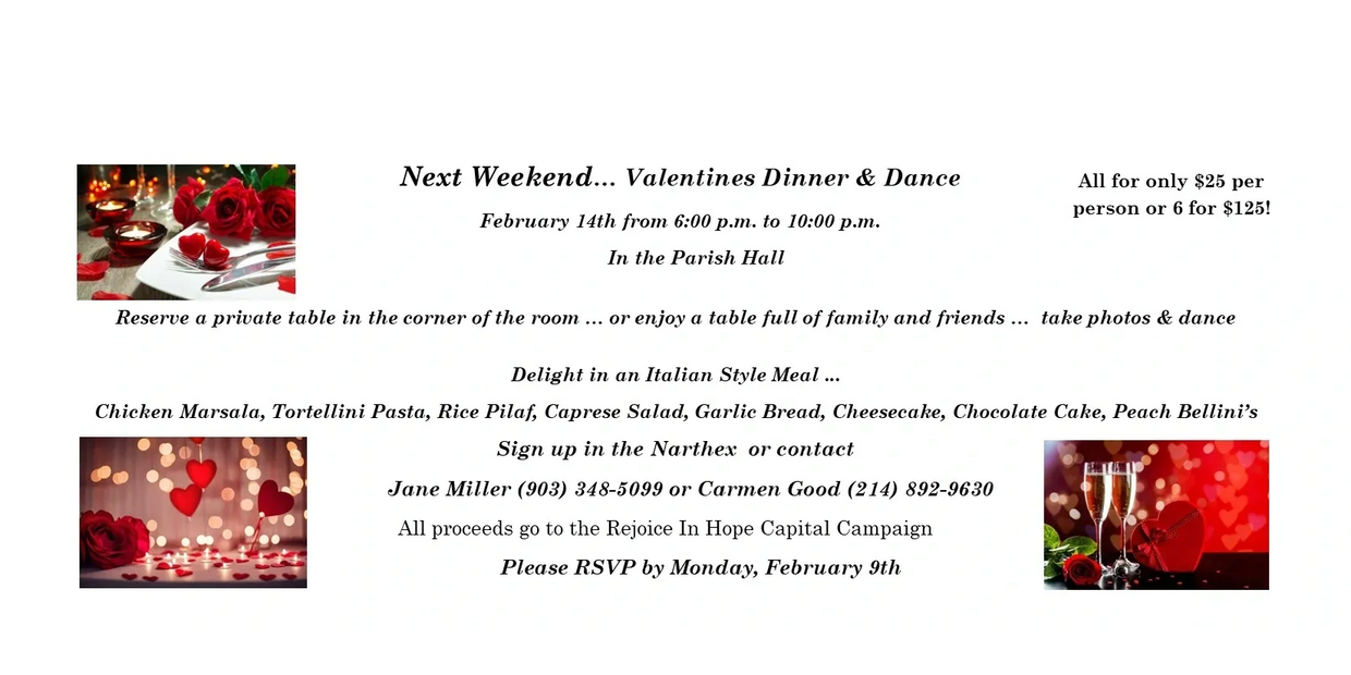 La Adoración al Santísimo Sacramento será este viernes, 6 de febrero. Por favor, apúntate en el Nártex para pasar un tiempo con nuestro Señor. Recuerda que cuando el Santísimo Sacramento está expuesto para adoración pública, alguien debe estar presente. ¡Así que, por favor, apúntate!