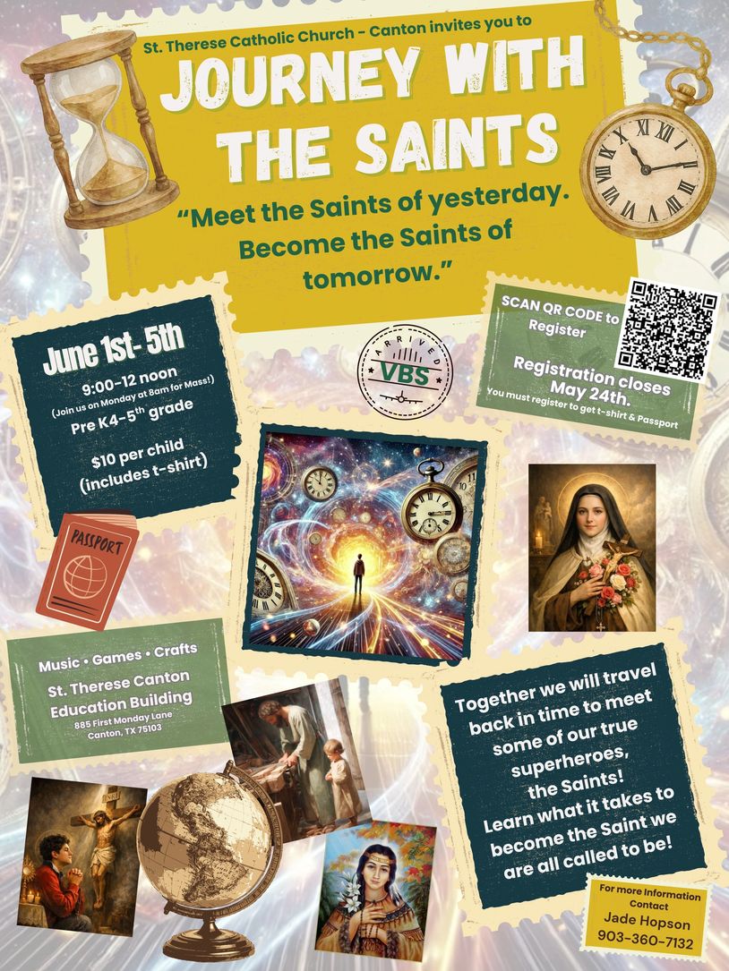 ¡Hola niños! ¡Prepárense para una semana emocionante de diversión, amigos y fe en la Escuela Bíblica de Vacaciones del 1 al 5 de junio! Únanse a nosotros para disfrutar de música, historias bíblicas interesantes, manualidades creativas, juegos y actividades divertidas, ¡todo mientras aprenden cómo convertirse en santos! Todos los niños deben estar registrados antes del 24 de mayo. Contacta a Jade Hopson para ser voluntario. Por favor, consulta el volante en el Nártex o el Boletín para más información.